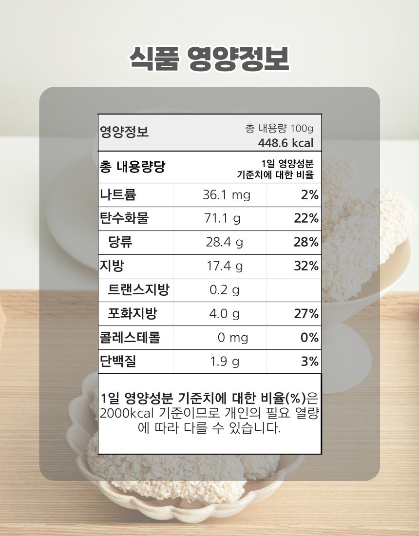 1회제공량당함량(100g당함량):448.6 kcal,나트륨 36.1mg(2%),탄수화물 71.1g(22%),당류28.4g(28%),지방 17.4g(32%)트랜스지방 0.2g,포화지방 4.0g(27%),콜레스테롤 0mg(0%), 단백질1.9g(3%) |